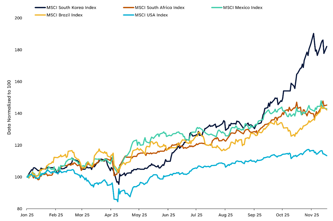 2025 has been an exceptional year for emerging market (EM) equities. South Korea has surged almost 80%, while South Africa, Brazil, and Mexico have each posted gains of more than 40% year to date. Within the MSCI country universe, six of the top 10 performers this year are emerging markets. This level of outperformance relative to the U.S. at the broad asset class level has been rare and, barring a strong late-year rotation, this will mark only the third time in the past 15 years that emerging markets have outperformed U.S. equities.