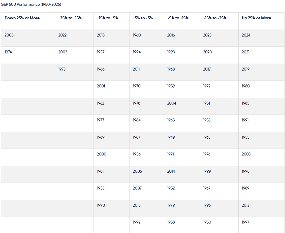- *2025 price gain for the S&P 500 is year to date through 11/24/25. Data series: 1950-Present.