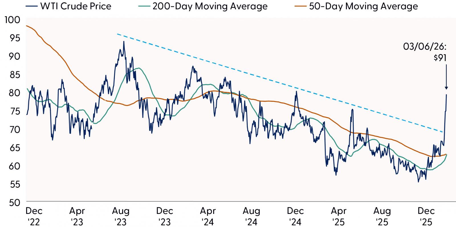 It’s difficult to separate the human and emotional side of war from the economic and market impacts. Without minimizing the human element, we focus on markets here. From that perspective, the energy market is the primary way through which this crisis will affect markets globally. Oil and natural gas production and transit have already been disrupted, sending prices sharply higher. If these disruptions are severe and long lasting, they have the potential to influence inflation expectations, weigh on business confidence, and elevate volatility across asset classes, all of which will likely translate into lower stock prices. Simply put, the more intense and prolonged the geopolitical shock, the larger the likely market impact.