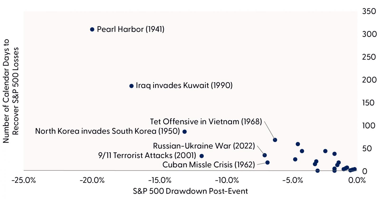 - Disclosure: All indexes are unmanaged and cannot be invested in directly. Past performance is no guarantee of future results. The modern design of the S&P 500 index was first launched in 1957. Performance before then incorporates the performance of its predecessor index, the S&P 90. Chart data includes 26 events in total. Events not labeled include Hungarian uprising ('56); Suez crisis ('56); Kennedy Assassination (1963); Gulf of Tonkin Incident ('64); Six-Day War ('67); Munich Olympics ('72); Yom Kippur War ('73); Reagan shot ('81); Madrid bombing ('04); London Subway bombing ('05); Boston Marathon Bombing ('13); Syria Bombing ('17); North Korea Missile Crisis ('17); Saudi Aramco Drone Strike ('19); Iranian General killed in Airstrike ('20); U.S. Pulls Out of Afghanistan ('21); Israel-Hamas War ('23); U.S.-Israeli Airstrikes of Iran Nuclear Sites ('25).