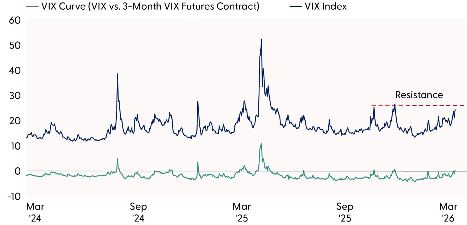 Because volatility tends to revert to its long-term average, the VIX is most useful at its extremes. Low readings can indicate investor complacency, while high readings may suggest markets are nearing peak fear. The recent jump in implied volatility has pushed the VIX to its highest point since last fall. A decisive move above the November closing high at 26.42 would imply additional upside risk in the fear gauge. Conversely, a failure to break above that level, particularly if it occurs alongside a shift back to a normal, upward-sloping VIX futures curve, could indicate that fear is topping out. At present, the futures curve is in backwardation, with near-term contracts priced above longer-dated ones, a rare pattern typically associated with acute market stress. A return to contango, the normal shape of the curve in which longer-term futures trade at a premium to near-term contracts, would suggest that peak fear may have been reached. Plus, the volatility of the VIX does not reflect elevated longer-term fear, which we take as an encouraging sign that the market is confident that this conflict will be over in relatively short order and that lasting damage to global energy infrastructure will be limited.
