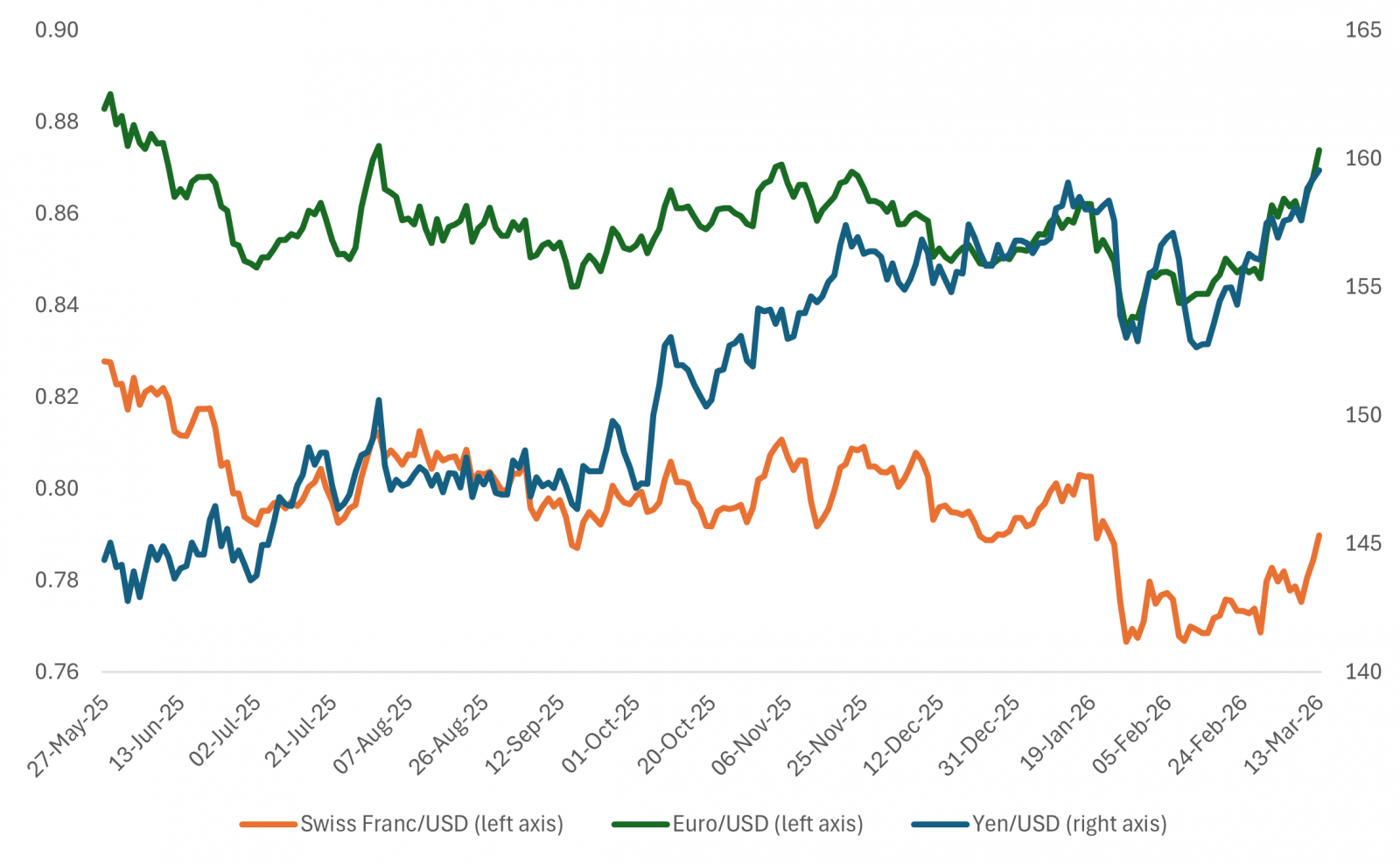 Third, investors continue to favor assets that offer unmatched depth and liquidity. U.S. Treasuries remain the world’s primary source of scalable, high‑quality collateral, and demand for them supports the dollar even when risk sentiment deteriorates. Notably, the dollar is appreciating relative to other traditional havens like the yen and Swiss franc, reflecting a preference for liquidity and market depth over low‑yield safety.