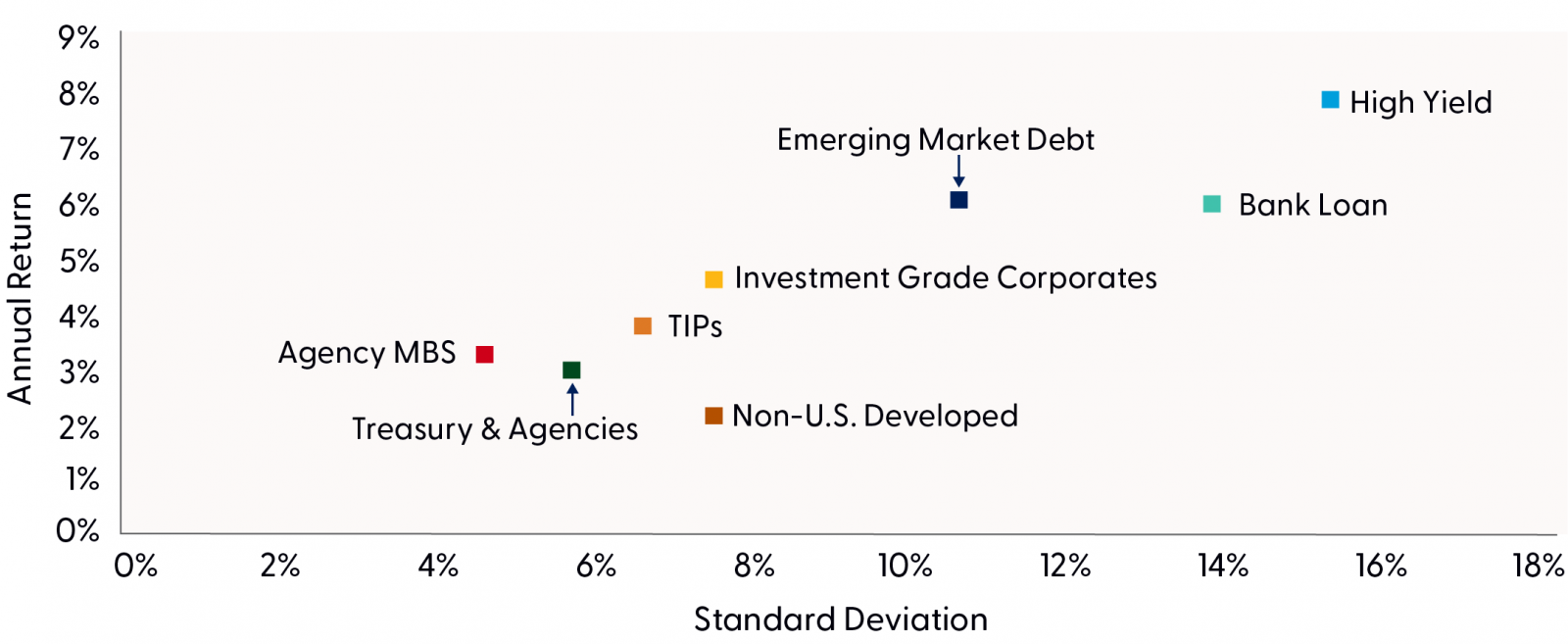 - Disclosures: All indexes are unmanaged and cannot be invested in directly. Past performance is no guarantee of future results. Indexes consist of: U.S. Treasury: Bloomberg U.S. Treasury Index; Investment Grade Corporate: Bloomberg U.S. Corporate (Investment Grade) Index; U.S. MBS Bloomberg U.S. Mortgage‑Backed Securities (MBS) Index; U.S. TIPS: Bloomberg U.S. Treasury Inflation-Protected Securities (TIPS) Index; U.S. Corporate High Yield: Bloomberg U.S. Corporate High Yield Index; EM USD Aggregate: Bloomberg Emerging Markets USD Aggregate Bond Index; Bank Loan: Bloomberg U.S. Floating Rate Bank Loan Index