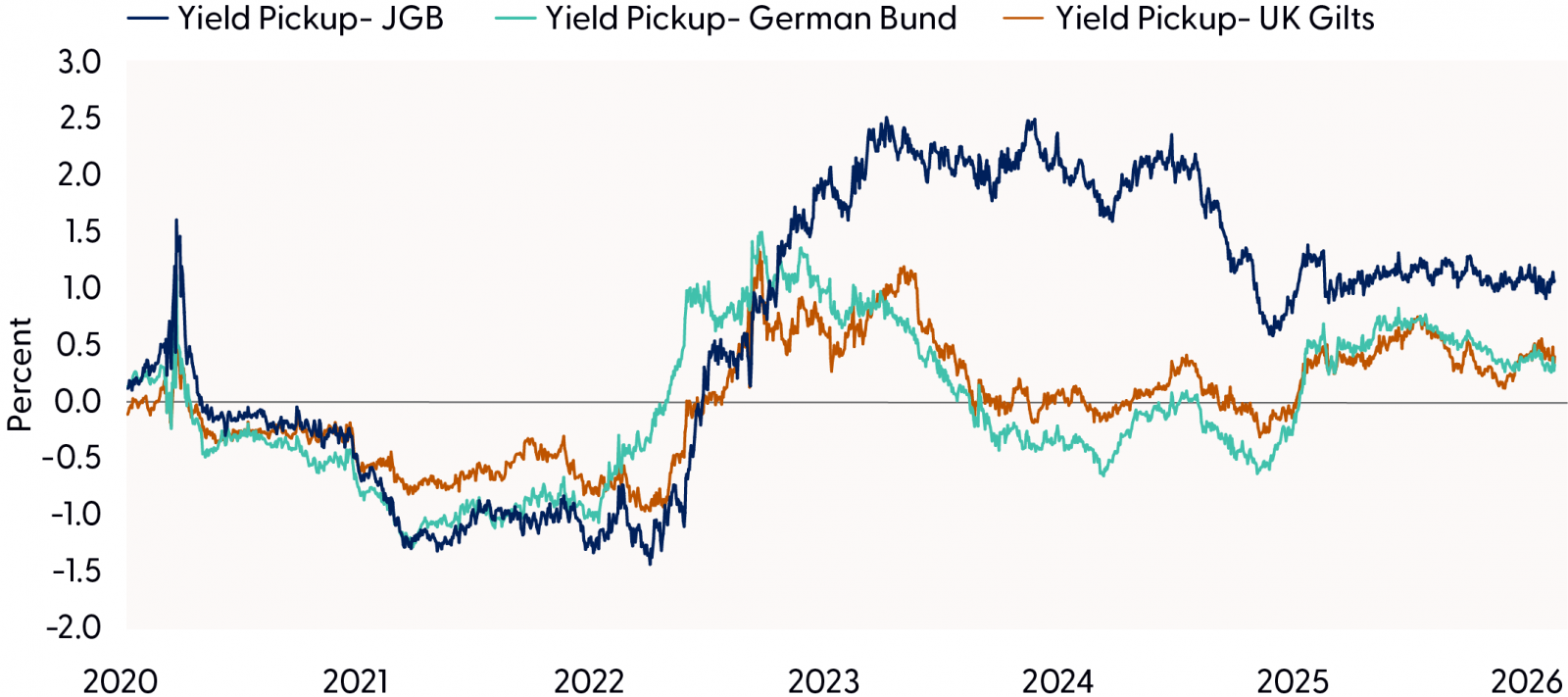 Global bond investing offers several compelling benefits for portfolios that are increasingly concentrated in U.S. fixed income markets. Most notably, global bonds can provide higher yields by expanding the investable universe beyond U.S. Treasuries and investment ‑ grade credit. Many non ‑ U.S. developed markets, especially when hedged back to the U.S. dollar (more on that in the next section) and emerging economies offer structurally higher interest rates, positive real yields, and steeper yield curves, creating attractive income opportunities that are difficult to replicate domestically. This yield advantage can be especially valuable in late ‑ cycle environments or periods when U.S. rates are constrained by policy or demand for safe assets.