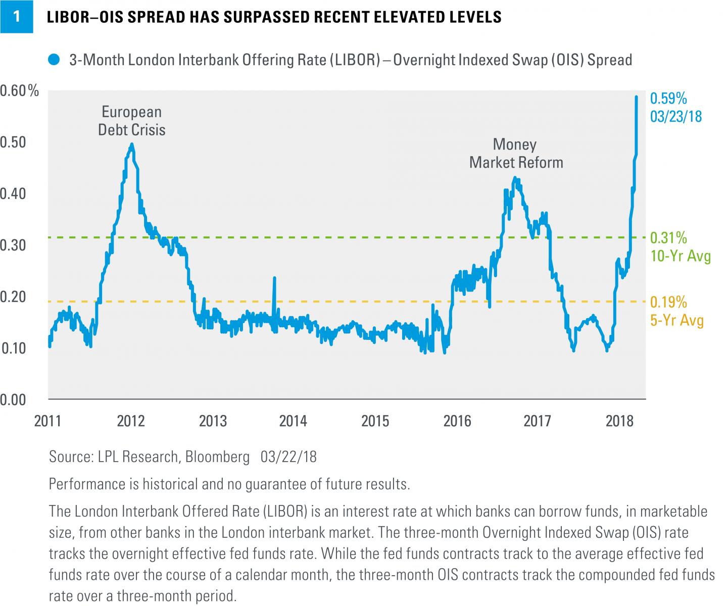 The spread between the three-month London Interbank Offering Rate (LIBOR) and the Overnight Indexed Swap (OIS) has widened to its highest level since 2008. This increase may be grabbing headlines, but in our view it is not portending anything ominous at this point. The three-month LIBOR is a good proxy for interbank lending, as it tracks the rate at which banks are willing to lend money to each other. It stands at 2.29% (as of March 23, 2018). OIS uses an overnight index rate, such as the overnight fed funds rate, making it a good proxy for central bank rates. It currently stands at 1.70%. Thus the spread between the two can be seen as an indicator of credit concerns within the banking system as an increase in the spread may indicate that banks are requiring higher interest rates on peer loans, suggesting deterioration in banks’ credit quality. Its recent sharp increase [Figure 1] has investors understandably concerned. The current level of 0.59% is well above the 0.19% 5-year average and the 0.31% 10-year average (which includes the very elevated levels during the financial crisis, when it peaked at 3.64% on October 10, 2008, over 3% higher than today’s level). The overall level, but also the consistency and pace of the rise, have been worrisome phenomena as well.